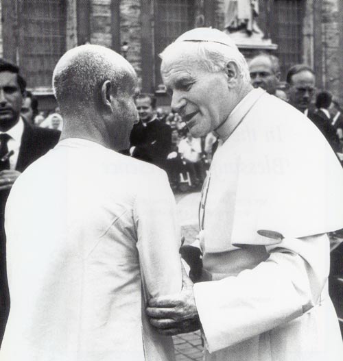 At the first meeting, in 1980 Sri Chinmoy presented a pamphlet of his work at the United Nations. The Pope said to Sri Chinmoy. "Special blessings to you. Special greetings to your members. We shall continue together."